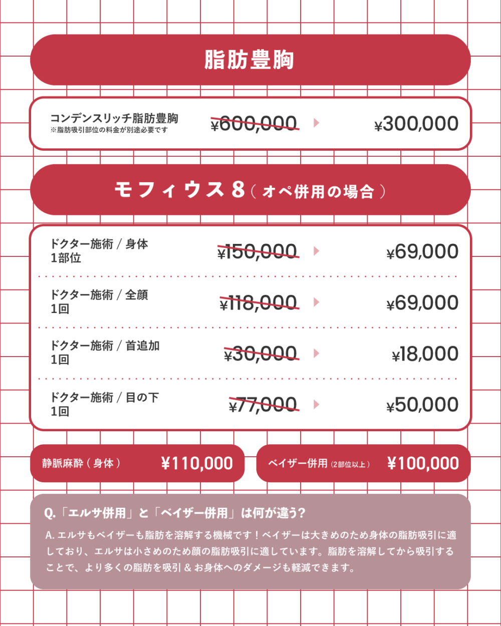 クマ取り、脂肪吸引、脂肪豊胸などの人気メニューのほかに、オペとセットで受ける方限定の特別皮膚科メニューもご用意しております❣️気温が低い秋〜冬はお洋服で隠れる範囲が多くなるため、外科施術のダウンタイムにもってこいです💪