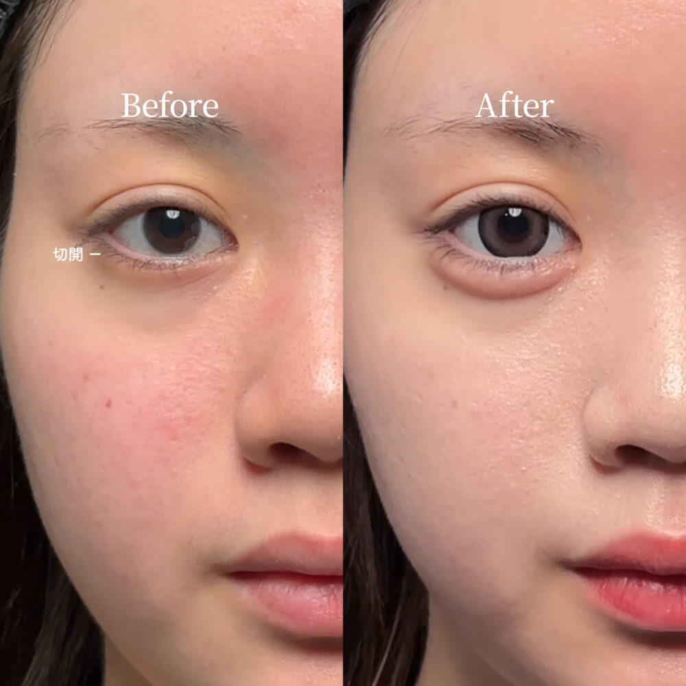 従来の施術が「詰め物で膨らませる」足す施術なのに対し、この施術は「影を作って浮き立たせる」の引くアプローチです。そのため、真顔の時はフラットで、笑った時だけぷっくりと出る、天然の涙袋と同じ動きを再現しやすくなります。