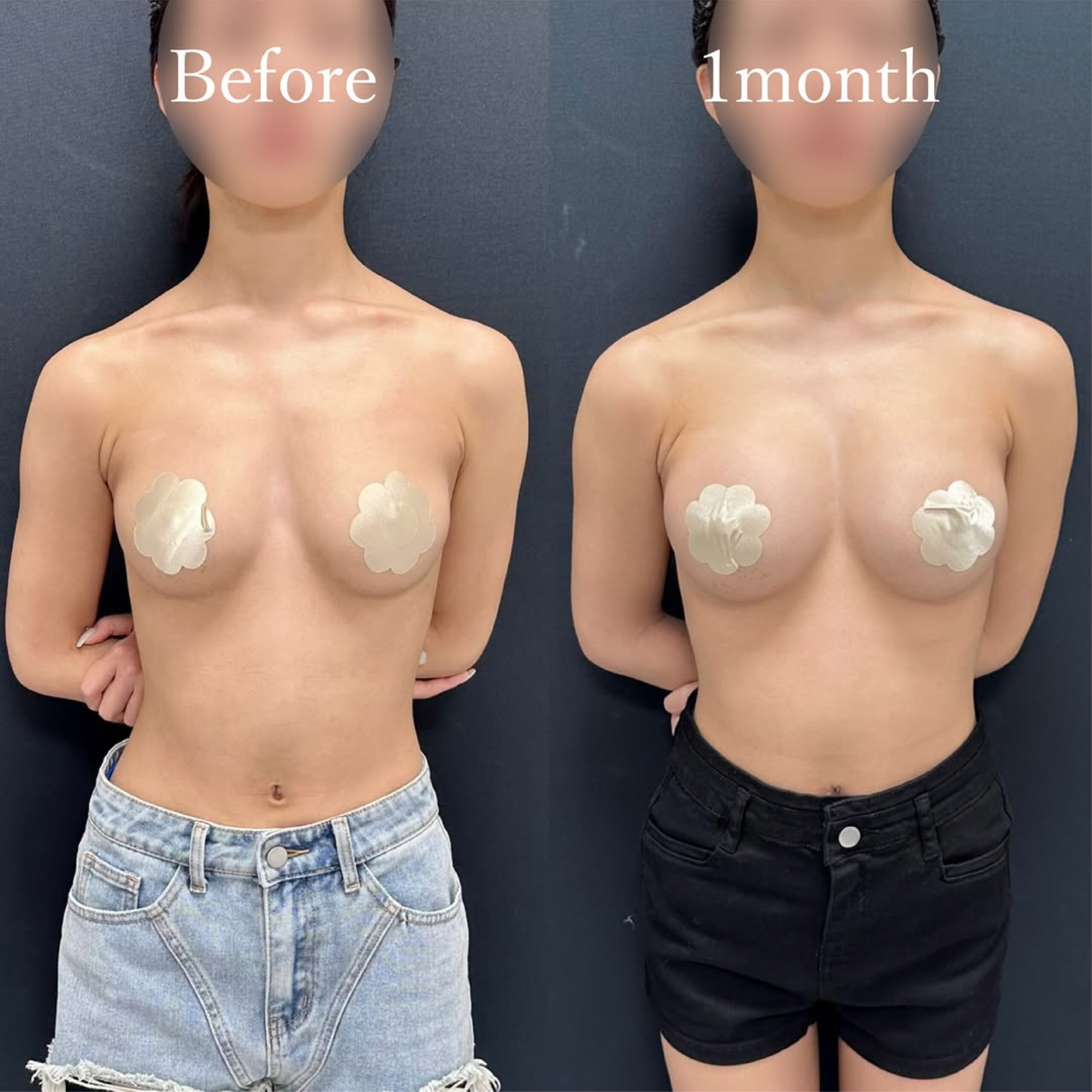 術後2週間ごろには内出血は消えることがほとんどですが、浮腫感と拘縮は残っています。浮腫と拘縮は術後3ヶ月ほどかけて少しづつ改善するとお考えください。この方は大変ダウンタイムが軽いため1ヶ月でも見てわかる変化を得ることができていますが、多くの方は術後3ヶ月頃を完成系とお考えいただければと思います。