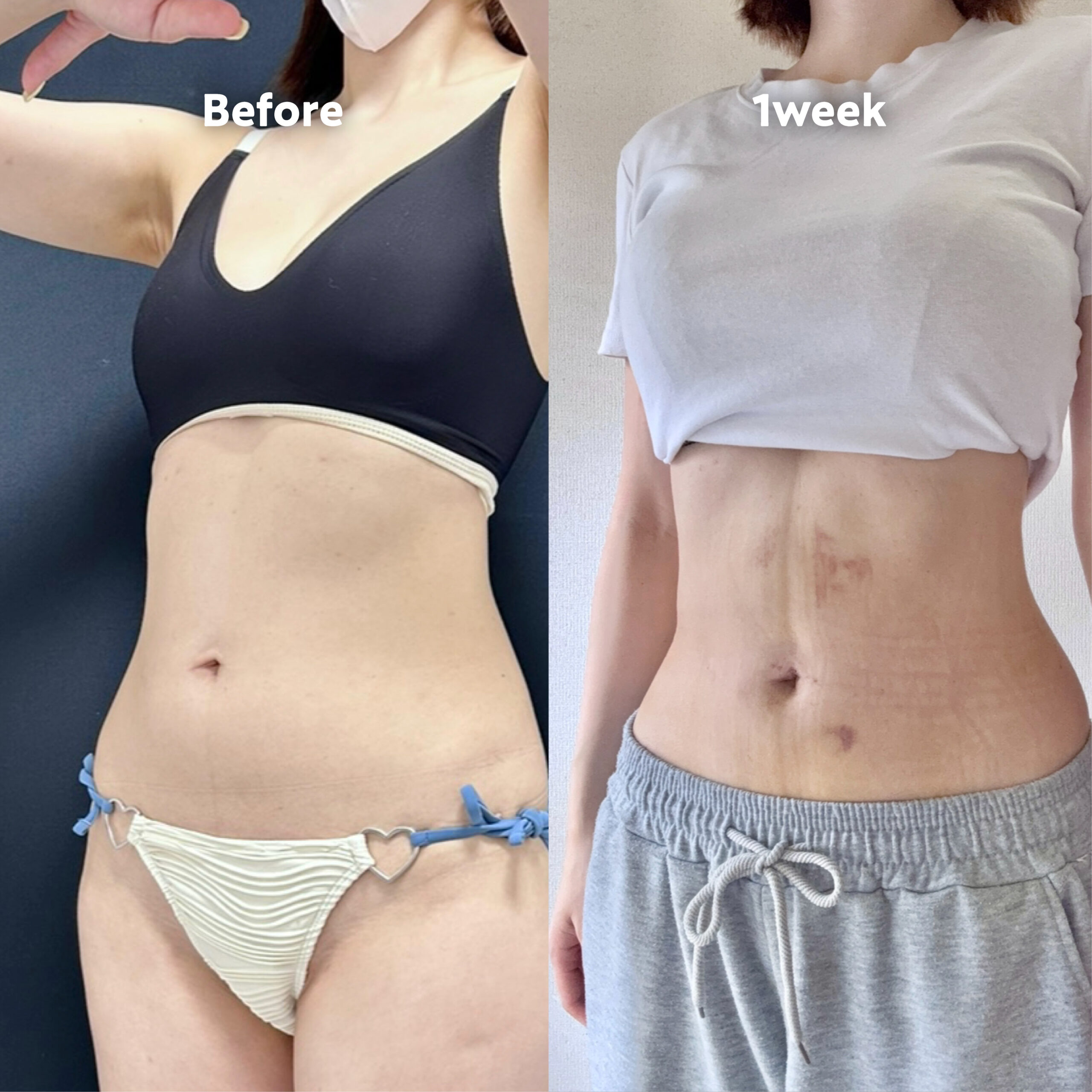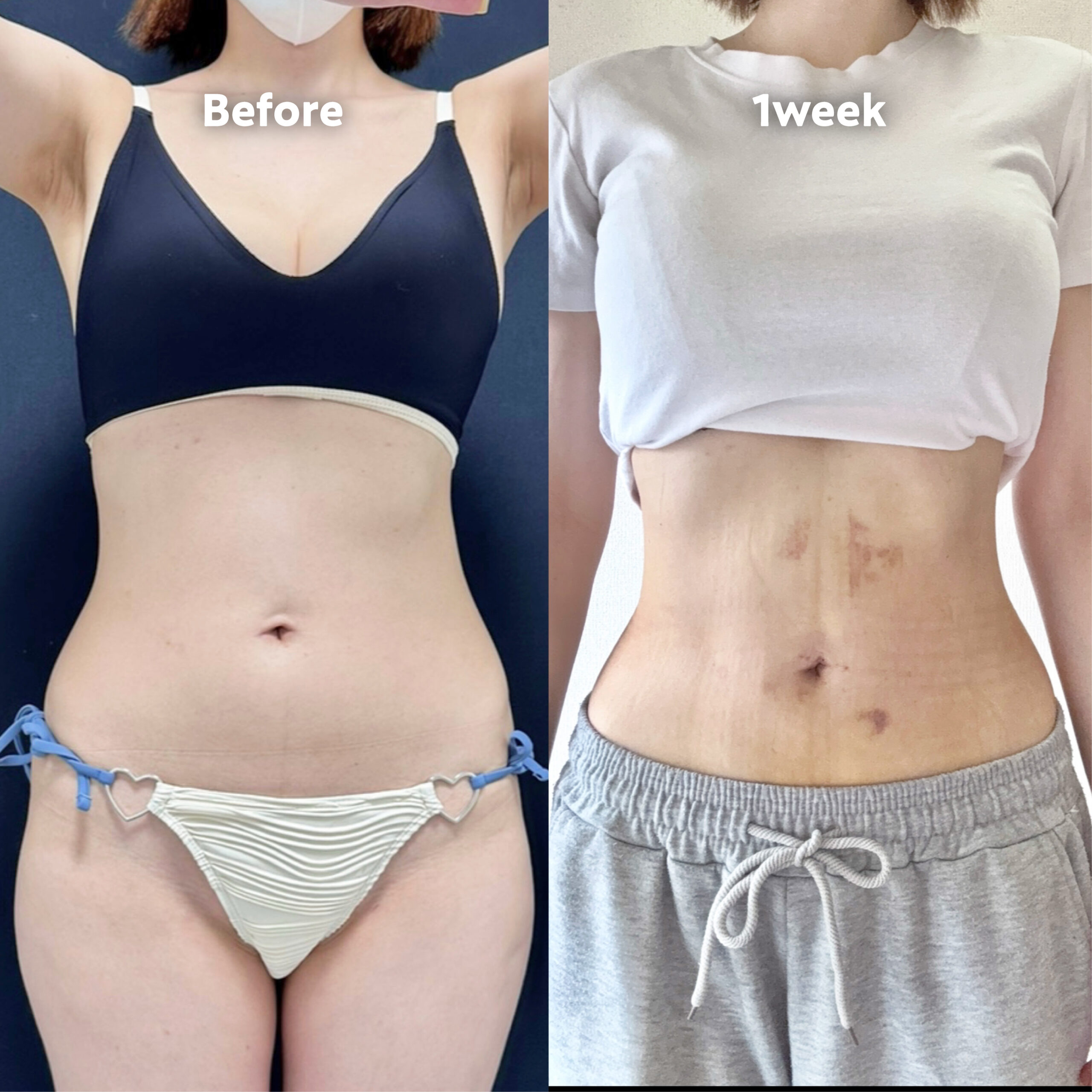 術後1週間ごろには施術部位に内出血が見られます。圧迫用のガードルをつけていただくためしっかりと跡がつきますが、吸引時にできたボコつきではありませんのでご安心ください。