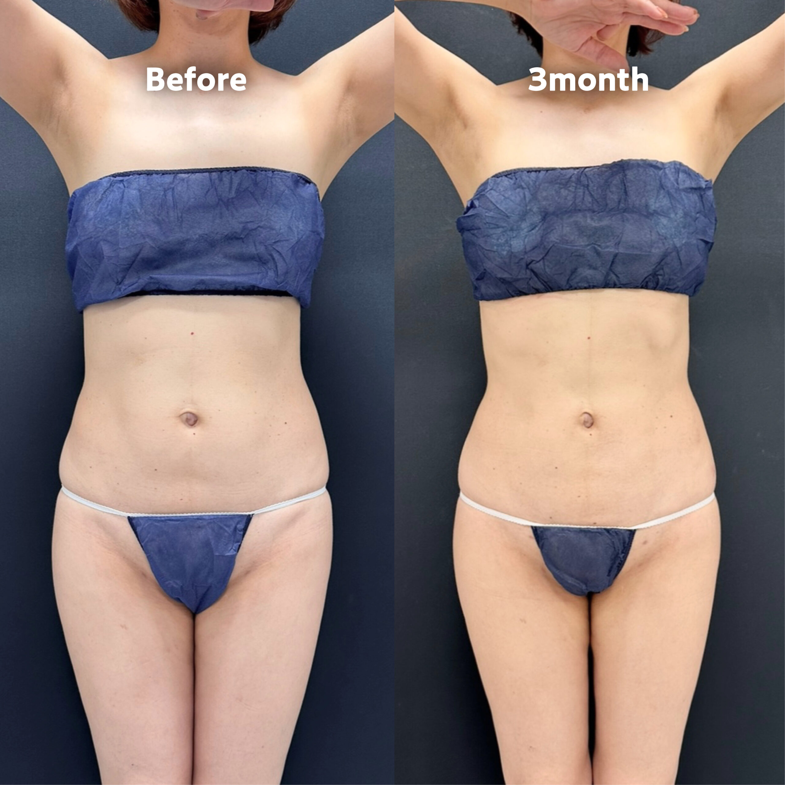 くびれから腰のラインをスッキリさせたいとのご要望のため、全体的なボリュームを減らしつつ滑らかなウエストに仕上げています。お腹の脂肪吸引を行なったことおへその形もスッキリと変化しています。
