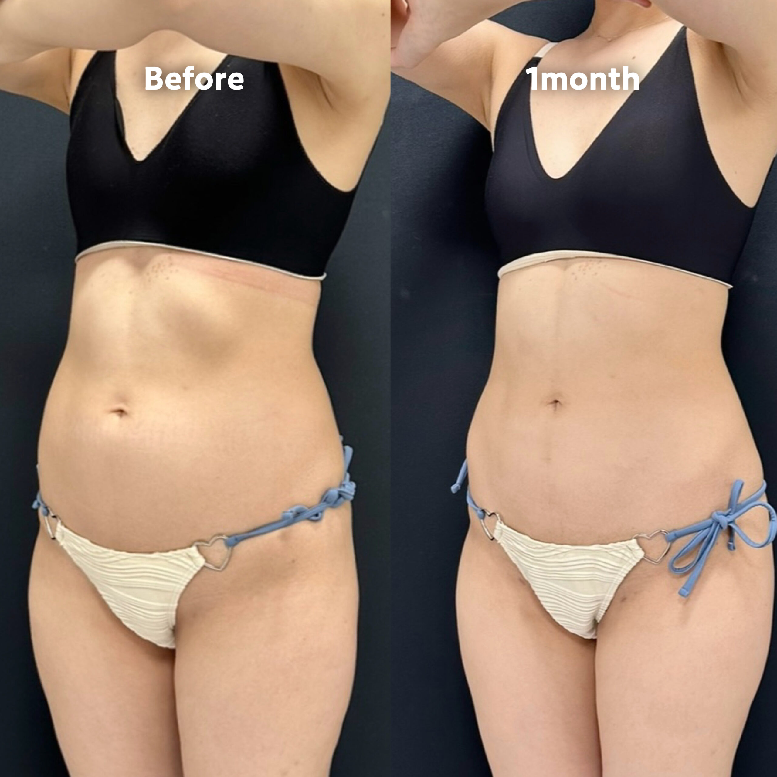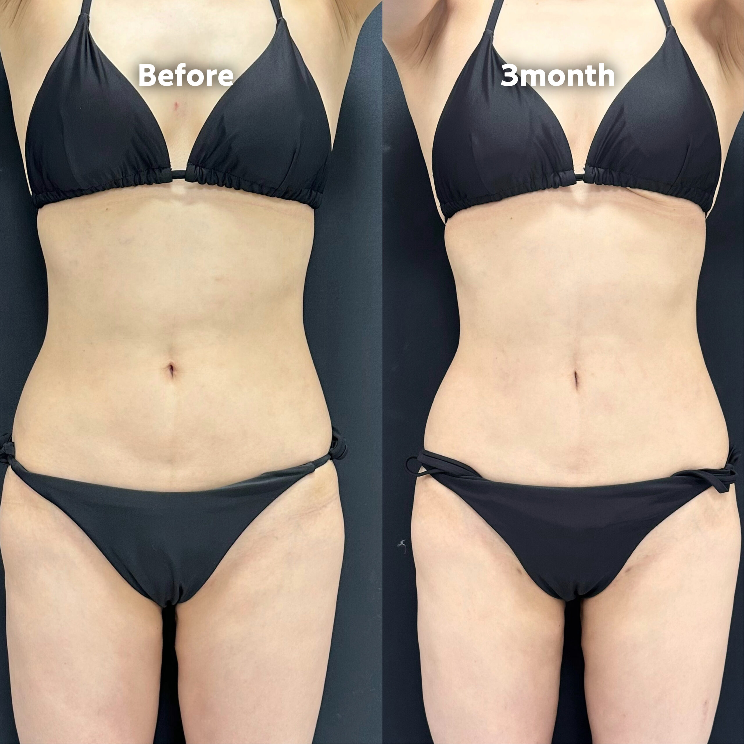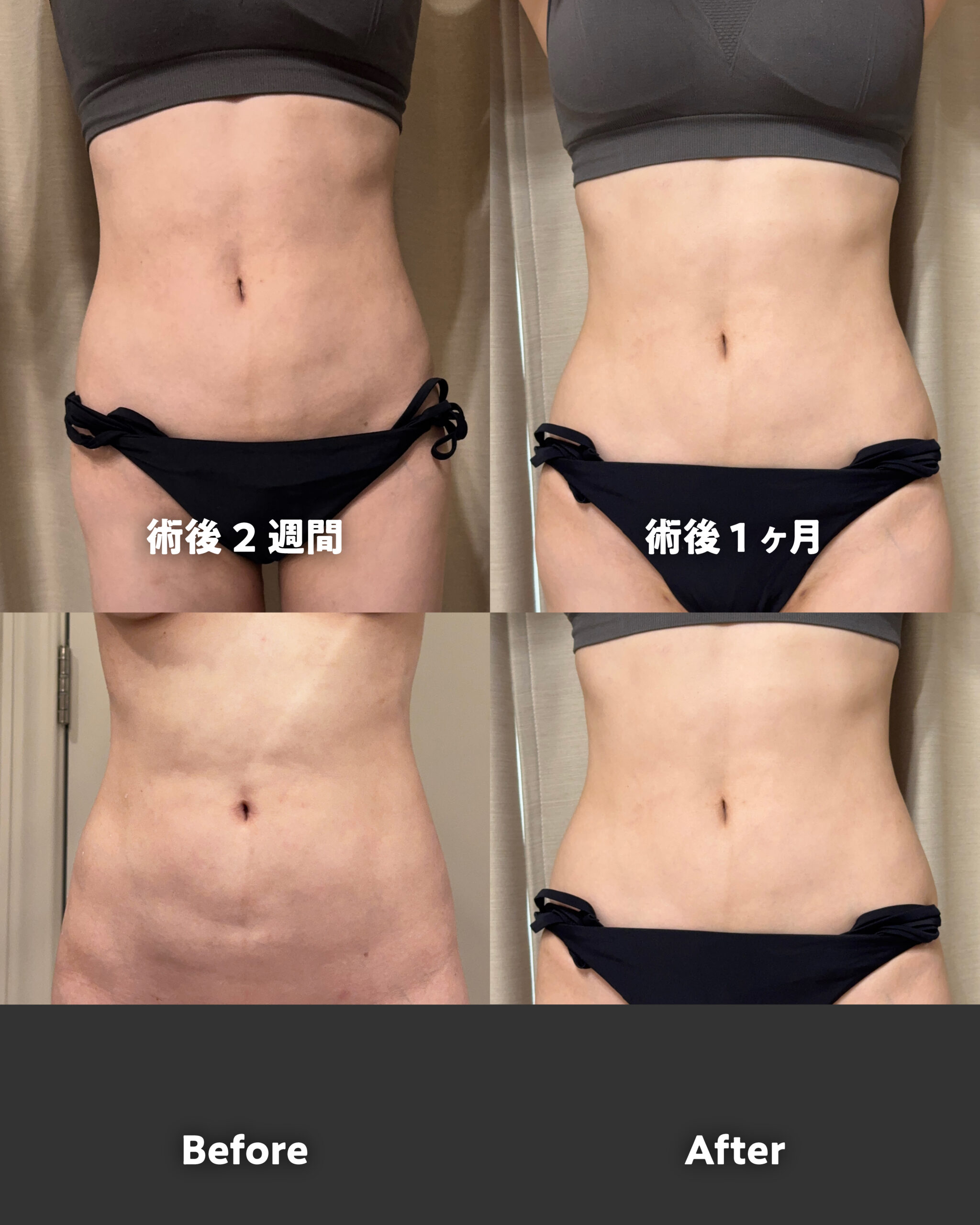 一度脂肪吸引をしたがあまり効果を感じられず、下腹にやや凹みが残ってしまったというお悩みでした。一度吸引した部分は組織が固くなっているため、ベイザーでしっかりと溶かし、丁寧に吸引する必要があります。術後はボコつきなく全体的なボリュームが減少し、おへそも綺麗な縦型に変化しました。