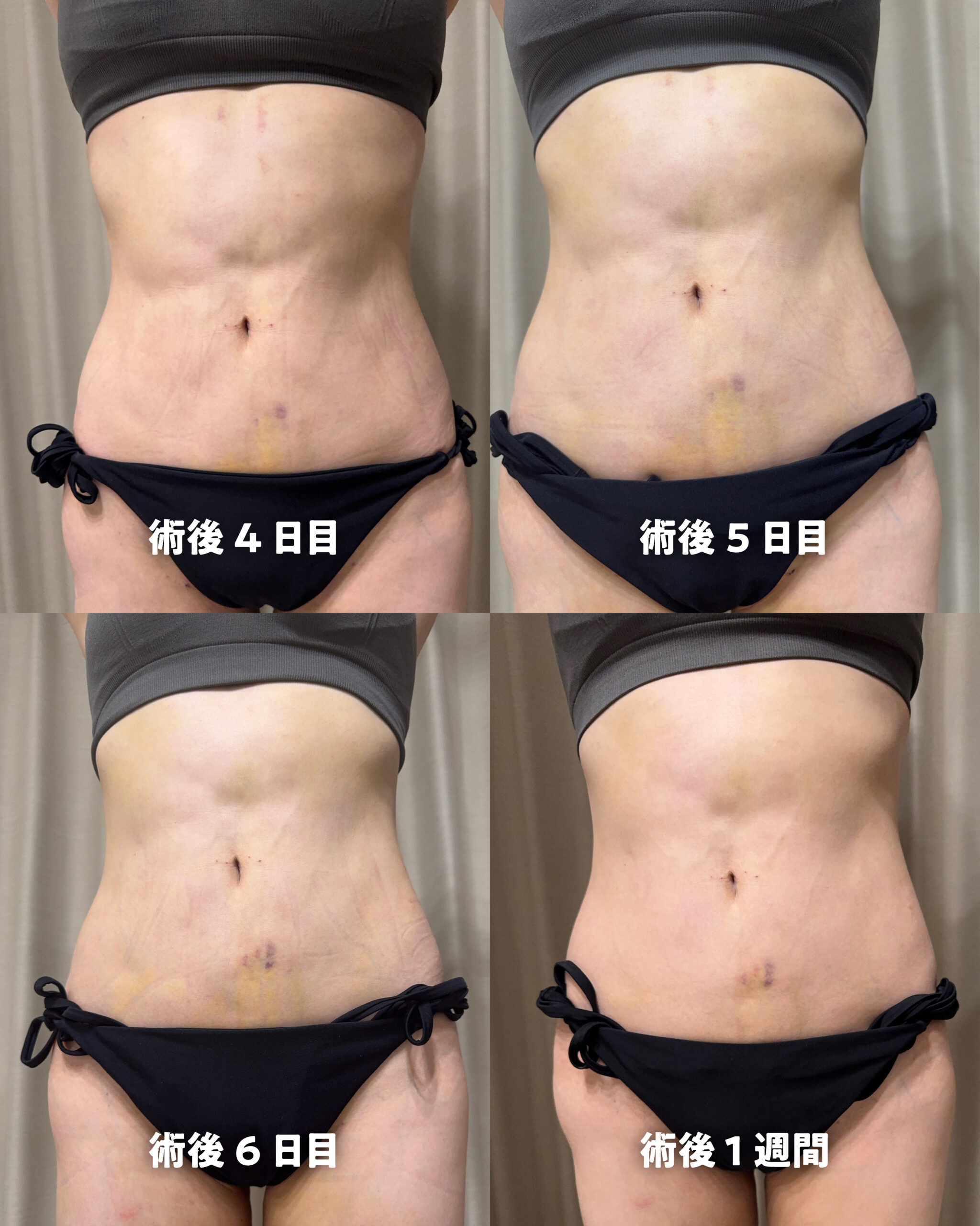 施術部位に全体的に黄色い内出血が見られます。内出血は紫~黄まで個人差がありますが、黄色に近いほど回復していると判断していただければと思います。シャワー時以外は着圧ガードルを着用しましょう。腫れ感・浮腫感ともにあるので動きづらい方が多いですが、術後4日目以降はお仕事も可能です。