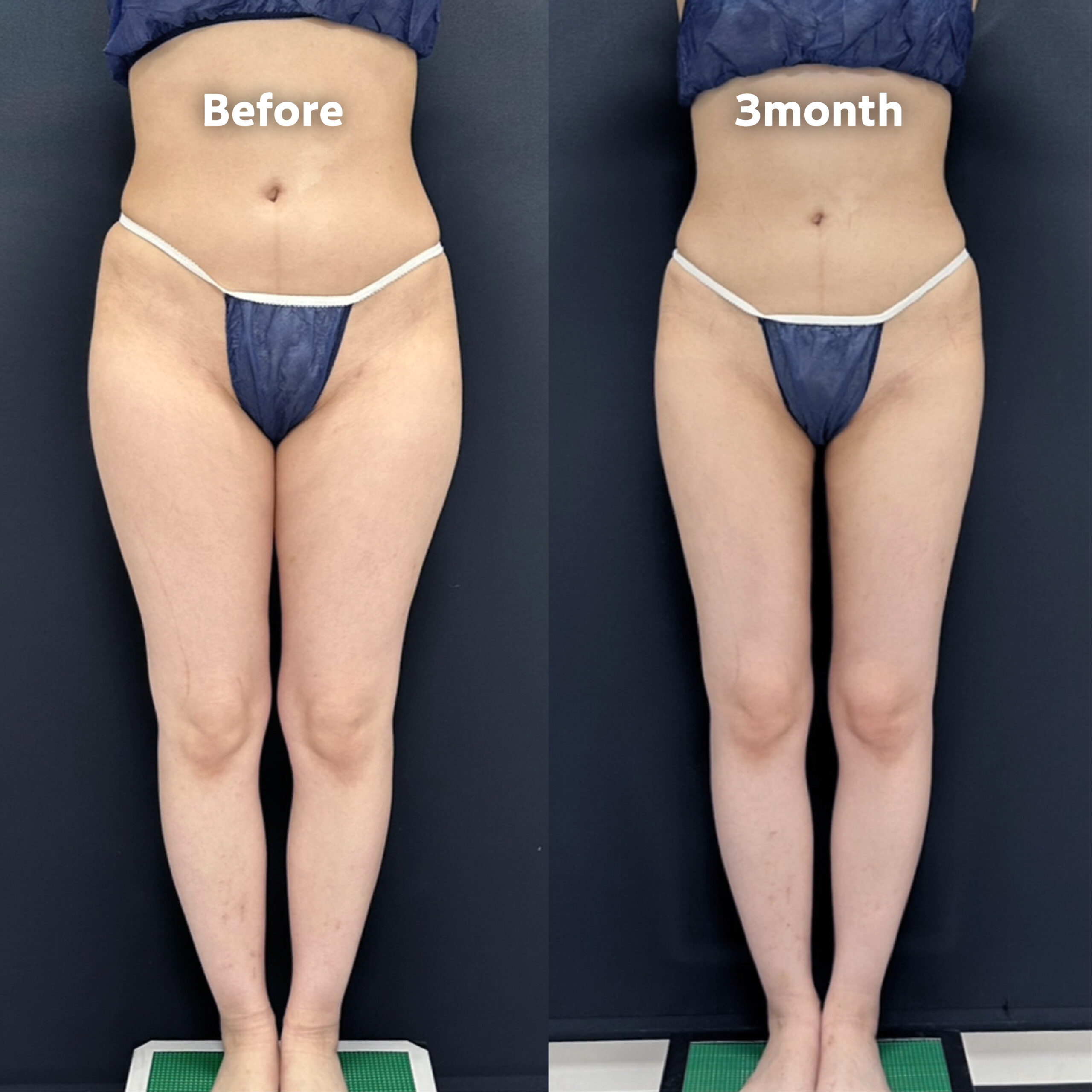 内出血は消え、見た目に出るダウンタイムはほぼ終了します。施術した部位は拘縮しますので、術後3ヶ月頃にかけて少しづつ柔らかくなるとお考えください。この頃には、術前と術後で細くなったことを実感していただけるはずです。
