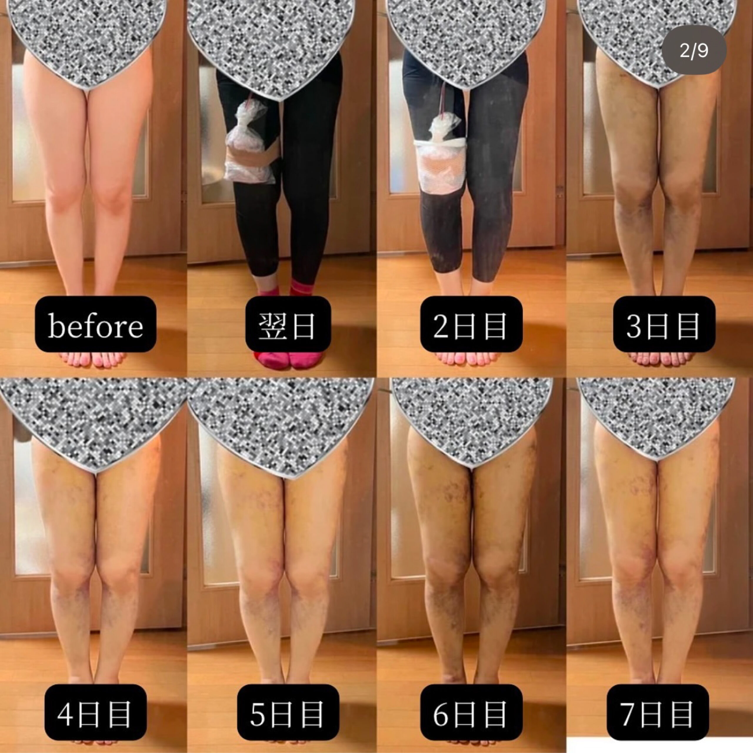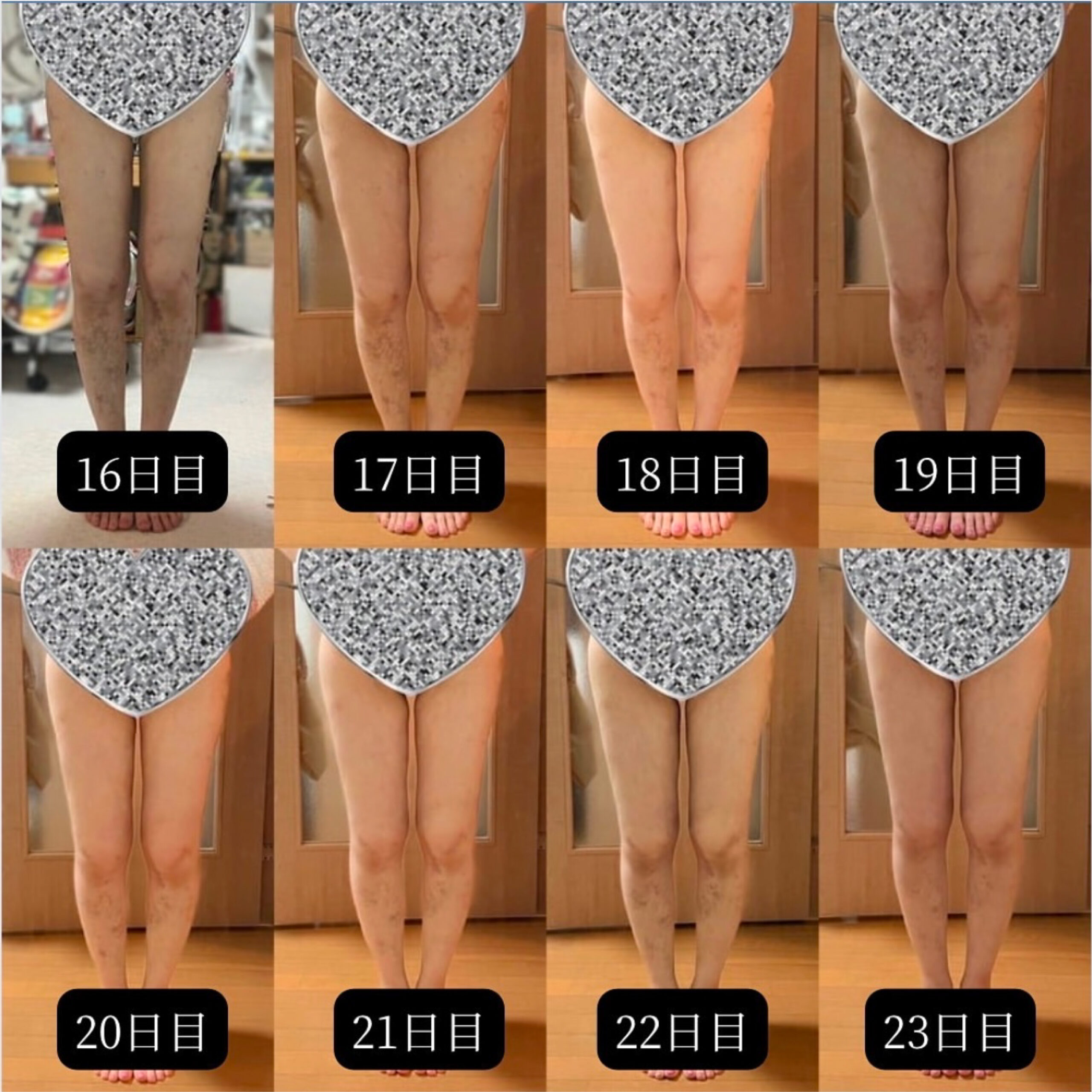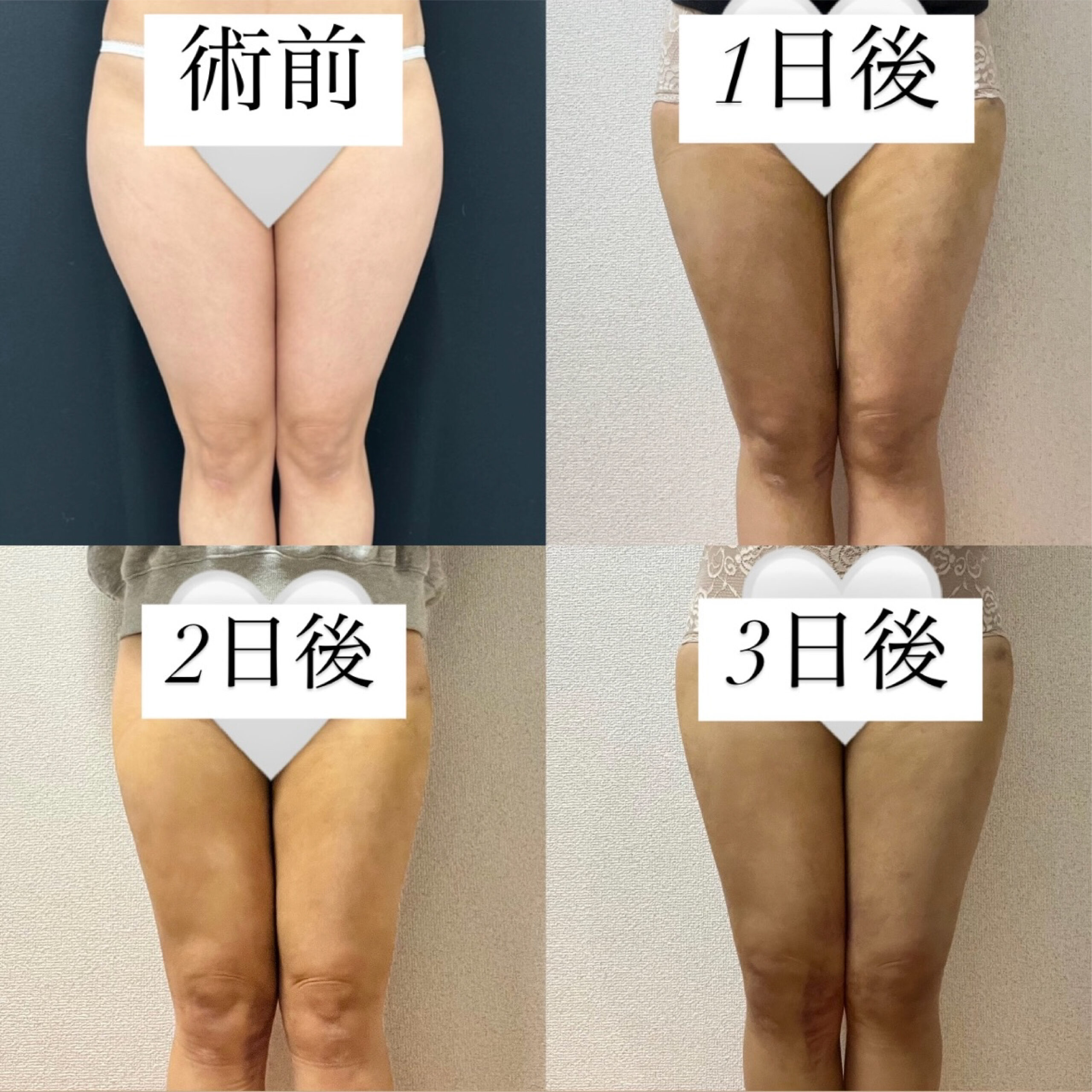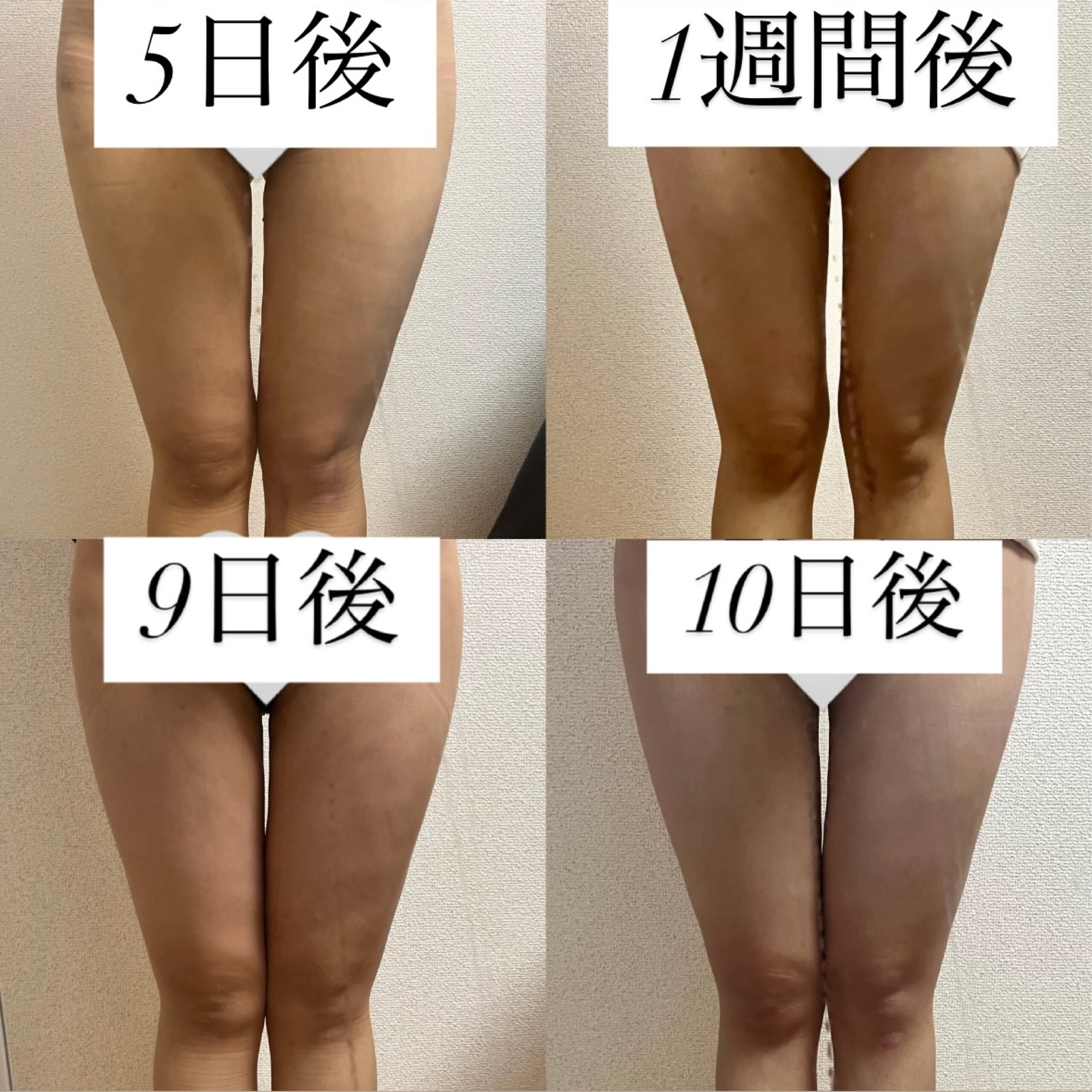 施術をした部位(太もも)に内出血が多く出る時期です。腫れ感・浮腫感ともにあるので動きづらい方が多いですが、術後4日目以降はお仕事も可能です。歩く分には問題ございませんが、走ることは難しいとお考えください。内出血は紫〜黄まで個人差がありますが、黄色に近いほど回復していると判断していただければと思います。シャワー時以外は着圧ガードルを着用しましょう。