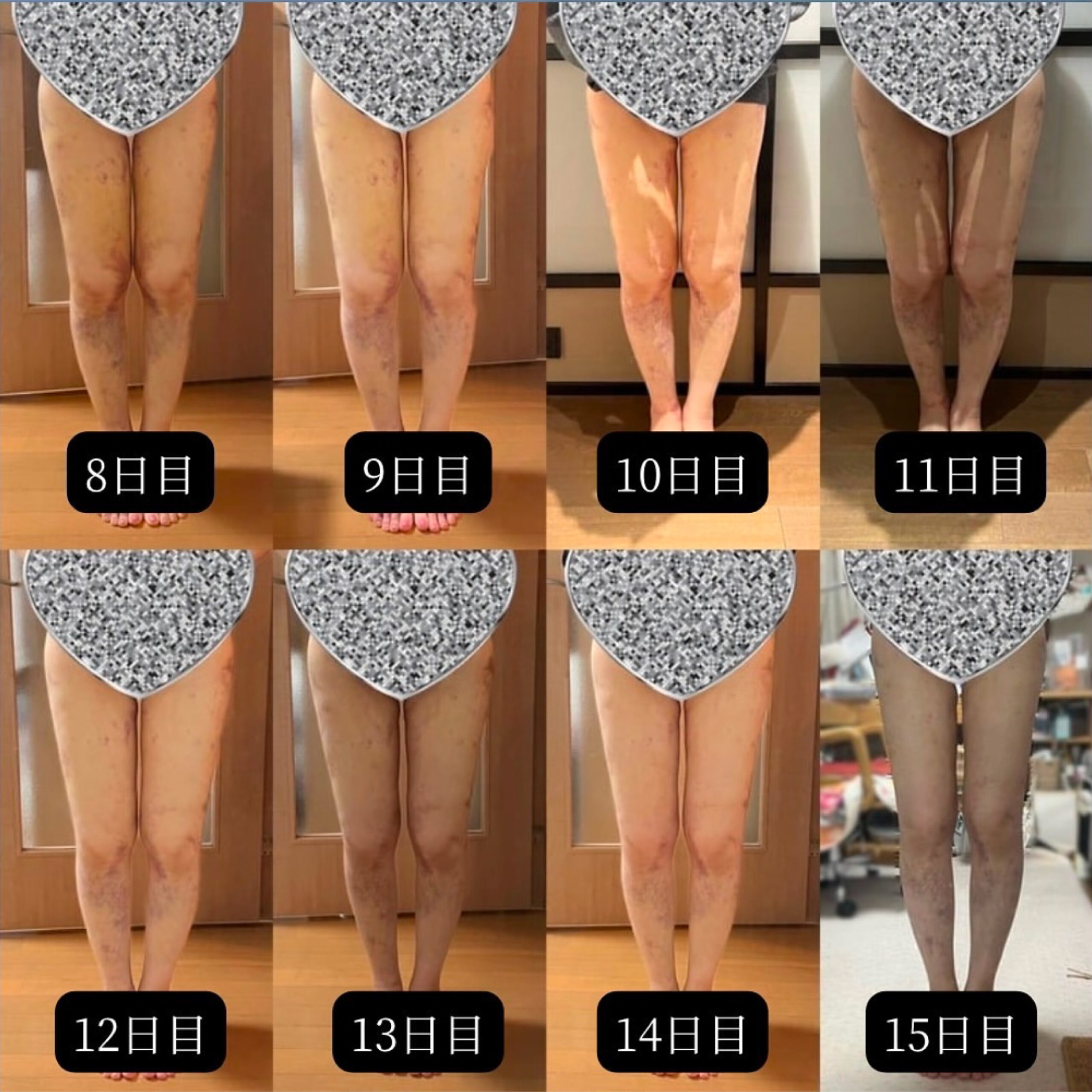 施術をした部位よりも下(ふくらはぎや足先)に内出血が出る時期です。腫れ感は減りますが、浮腫を感じやすく皮膚が突っ張る感覚があるでしょう。内出血が完全に消える期間については個人差がありますが、2週間〜を見て頂くと安心かと思います。歩きにくさは徐々に改善します。
